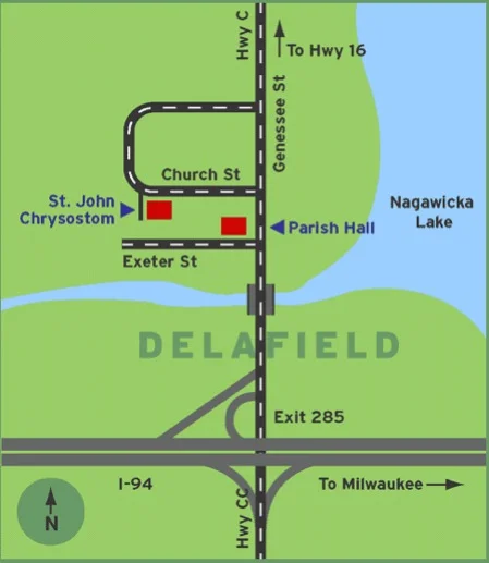 St. John Chrysostom is located in Delafield, Wisconsin, overlooking the heart of downtown. Below you can see a few maps that can be helpful for locating both our church building, as well as our parish hall.